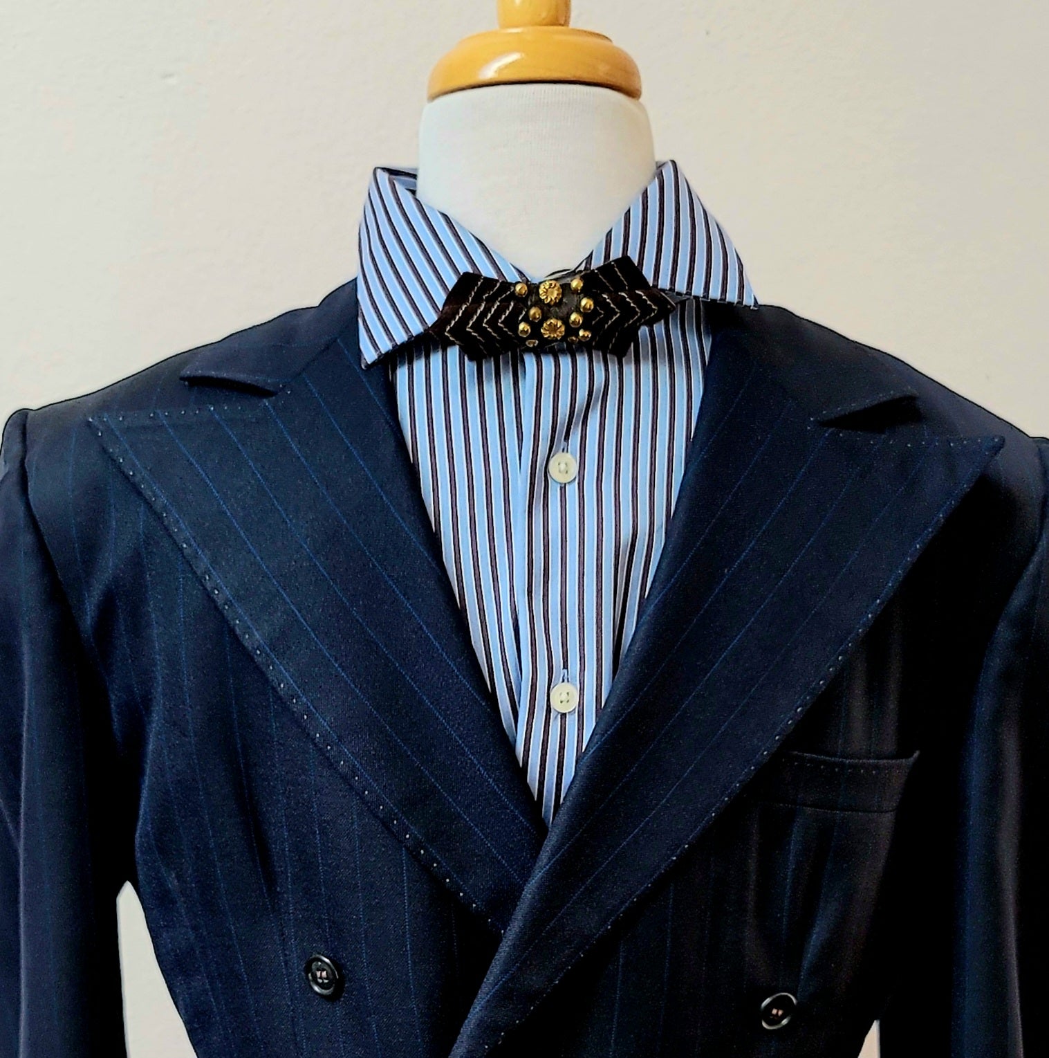Perfect accessory for your menswear look. This leather pin was created from a vintage shoe clip with vintage gold trim accents. Wear it as a bow tie or a lapel pin.