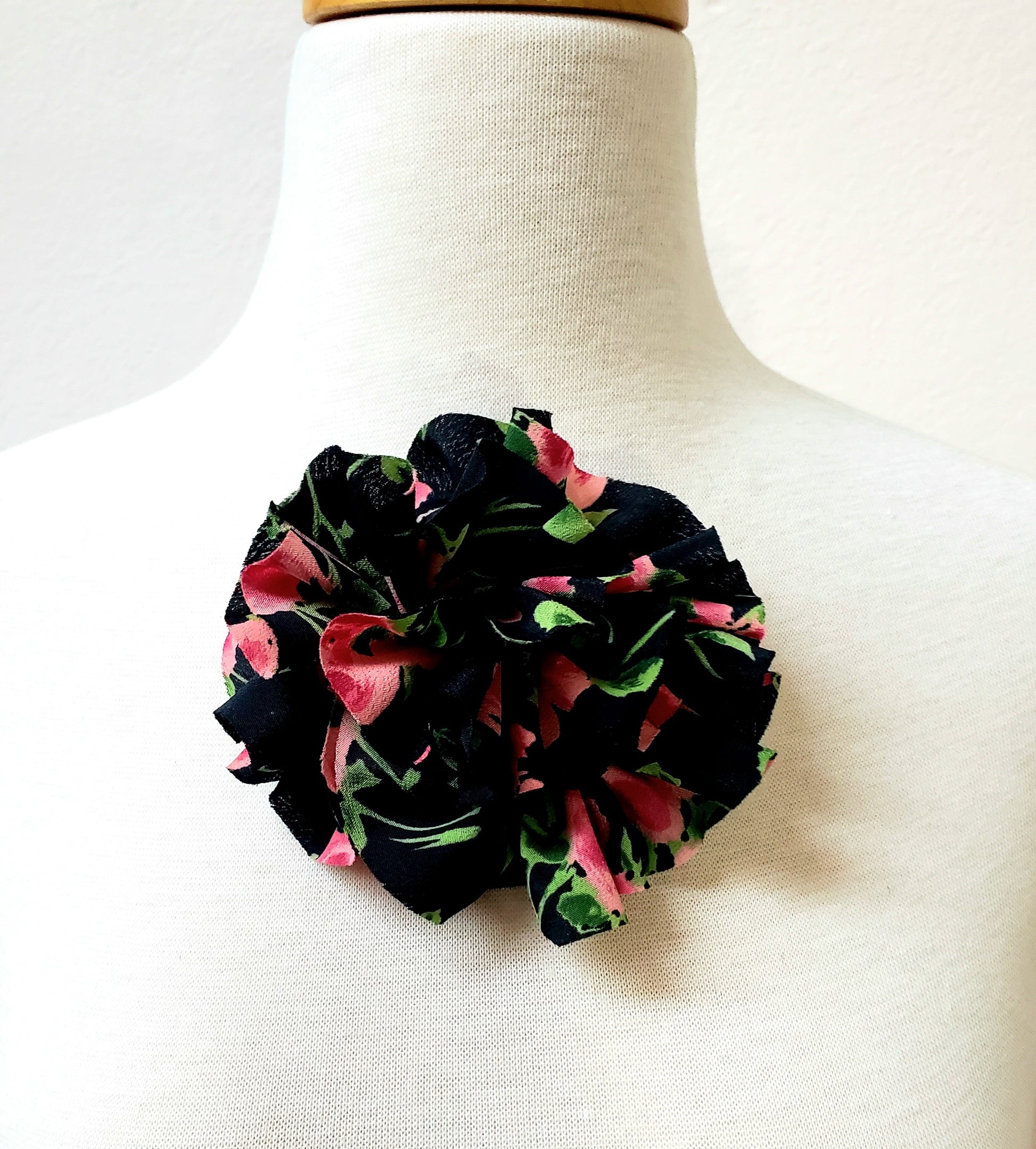 My inspiration for this design is influenced by the large broaches women wore in the 40's. This one is made with reclaimed floral poly-silk fabric.